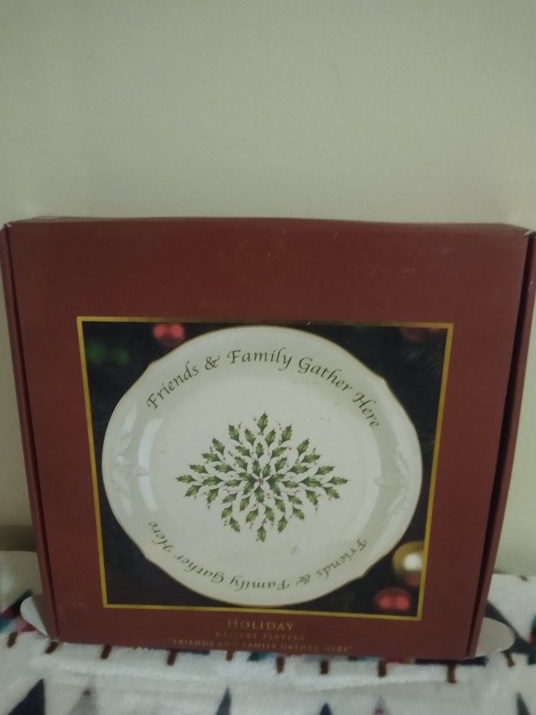 3 Lennox Holiday China pieces vintage from the 1990's. Included is a 12" Holiday Dessert Plate with the words "Friends and Family Gather Here". A Hope Dish & a Divided Condiment Dish. All pieces have the Holly & Berries design. Excellent condition with no chips or cracks with 24k gold accents. Original boxes included .