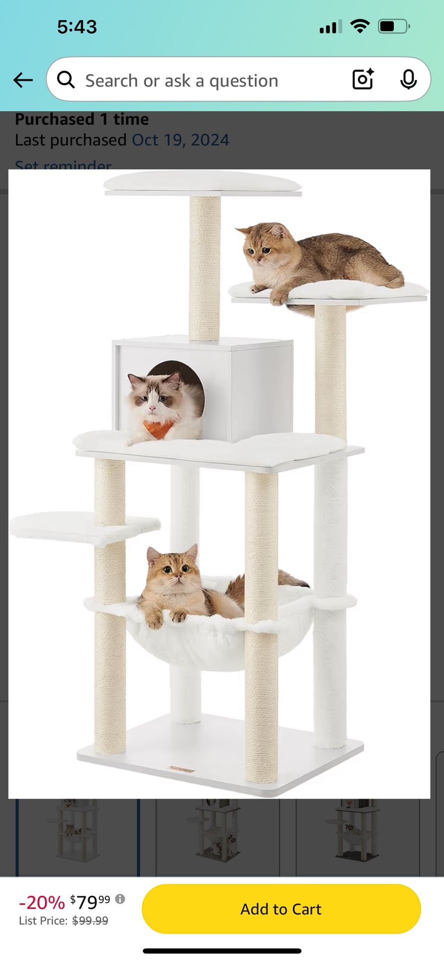 Big cat tree - only had for a year but my cat preferred to sleep in my bed. He did like the hammock part but very rarely - the cat tree is in practically new condition. Sad to be getting rid of it but my kitty is getting a bit too big and we are making a move out of Arizona next week.