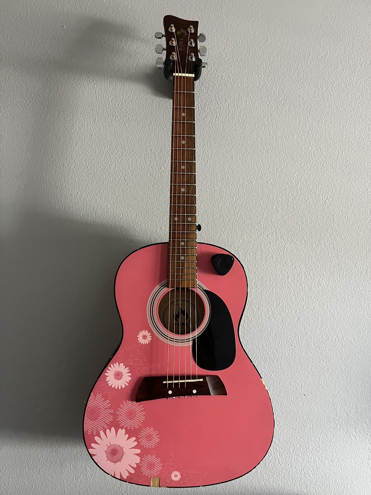 First Act EL3036 3/4 size acoustic guitar. Plays very well. Neck is straight. Lots of scuffs and scratches as seen, but no major damage. Great beginner or travel guitar. Local pickup in Ocoee, FL.