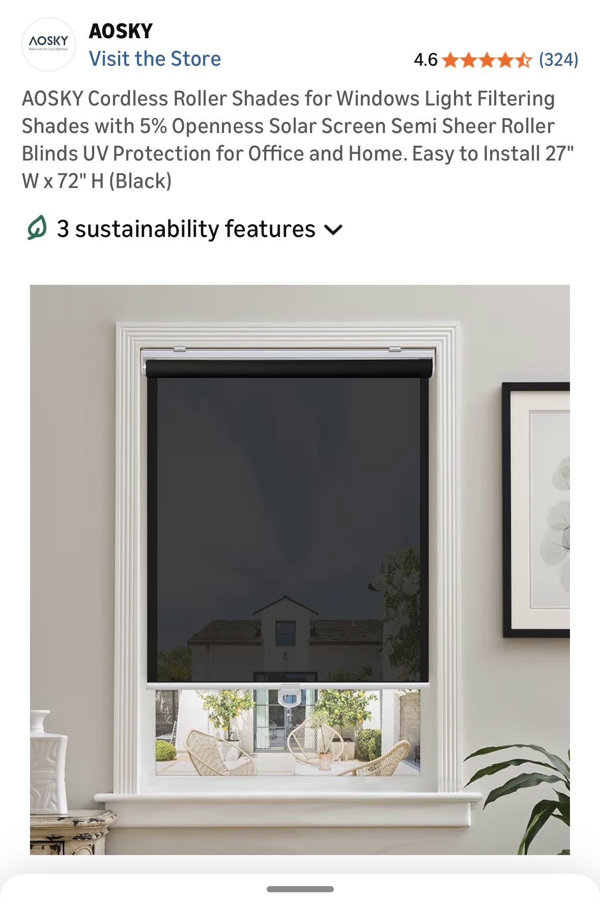 AOSKY Cordless Roller Shades for Windows Light Filtering Shades with 5% Openness Solar Screen Semi Sheer Roller Blinds UV Protection for Office and Home. Easy to Install 27"" W x 72"" H (Black) brand new and sealed, comes with installation guide and hardware pick up and cash only home decor window coverings roller shade cellular honeycomb faux wood [ECO-FRIENDLY FABRIC ]: Light filtering roller shade is 154% polyester fabric. Good ventilation capability, anti-static, dust-proof and durable. The aluminum bottom rod replaces the plastic bottom rod to improve the overall stability, so that the panel and the bottom are on the same level, not easy to tilt, prevent wind blowing, and give users a better experience. [PROFESSIONAL AND UNIQUE DESIGN]: Our light filtering roller shades use woven technology to keep the room bright while blocking light. In addition, exquisite cordless lift mechanism could easily achieve raise and lower lift just by pull-push and it is safer for kids and pets. [FASHIONABLE STYLE]: The high-end fashion design style makes our roller shades more like home decorations rather than just a piece of furniture. A variety of different colors and sizes to choices can adapt to the various decoration styles of room, perfectly creating an open, chic, warm and comfortable space. [CONVENIENT INSTALLATION]: Our roller blind installation steps are simple and convenient. A window frame depth of at least 56 inches is required for installation and choosing the size of the roller shade according to the width of the window frame. The roller shade comes with an installation package, including installation instructions, installation screws, aluminum frame brackets, to help you better install the product.
