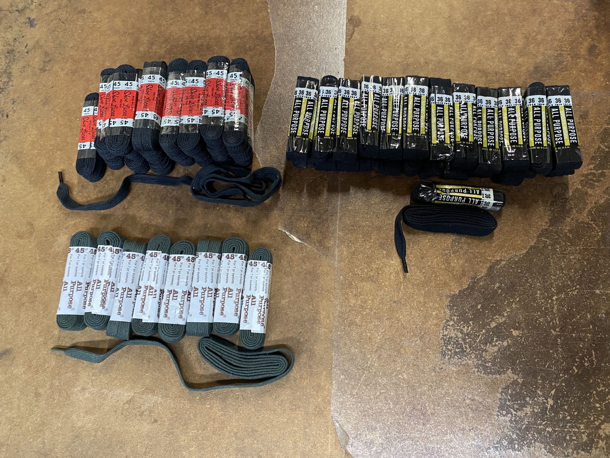 Have new old stock of shoe laces. Made in USA. Three styles: 1. ALL PURPOSE Extra Strength 36” Black shoe laces, 25 pairs 2. Shoe Laces 45” Black shoe laces, 21 pairs 3. All Purpose 45” Army Green shoe laces, 8 pairs SELLING ALL 54 PAIRS FOR $50. Great for lacing tennis shoes, hiking boots, work boots, etc.
