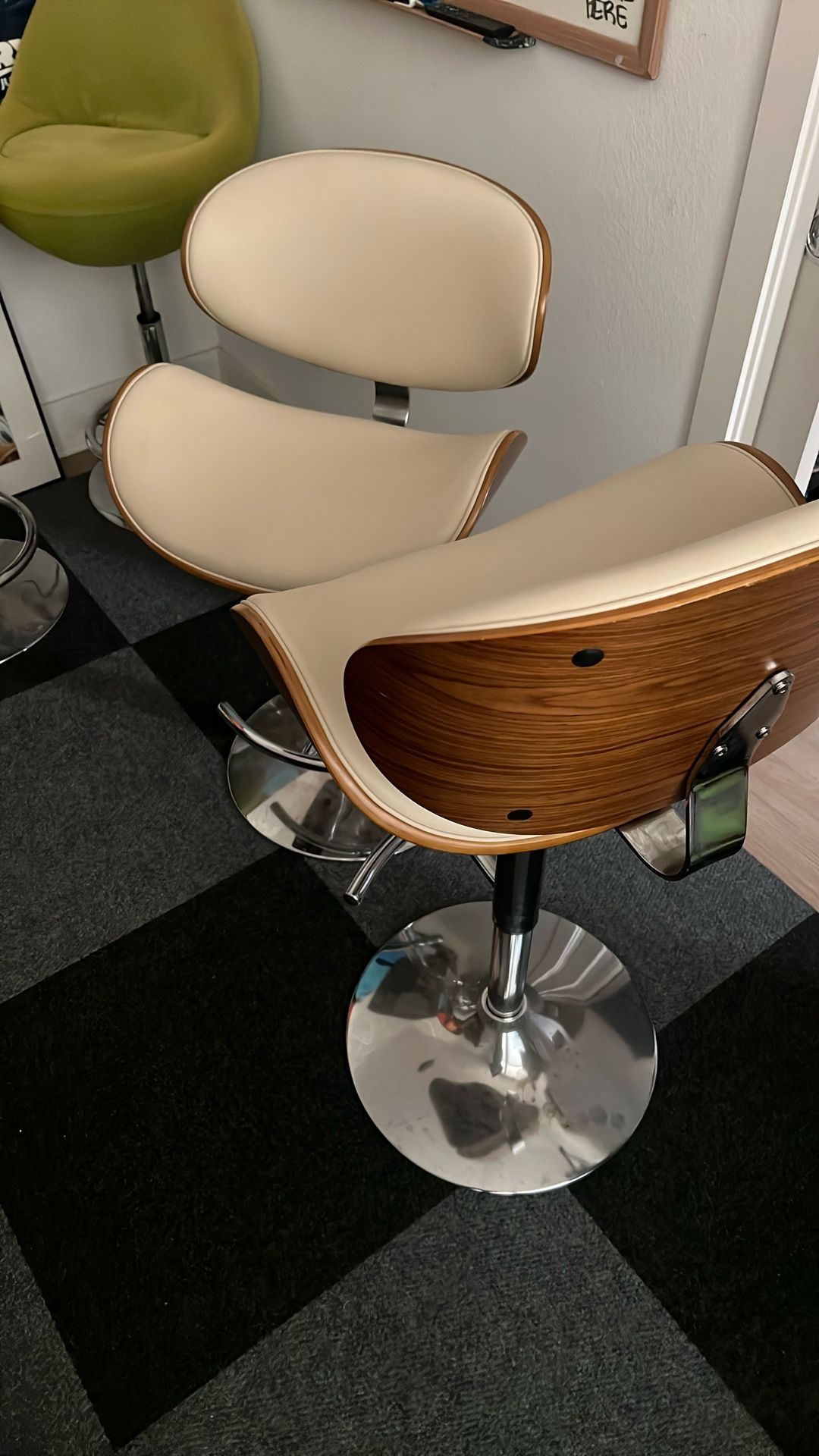 Curved seating. Comfortable, modern, cute. White and light wood seats with metal bases