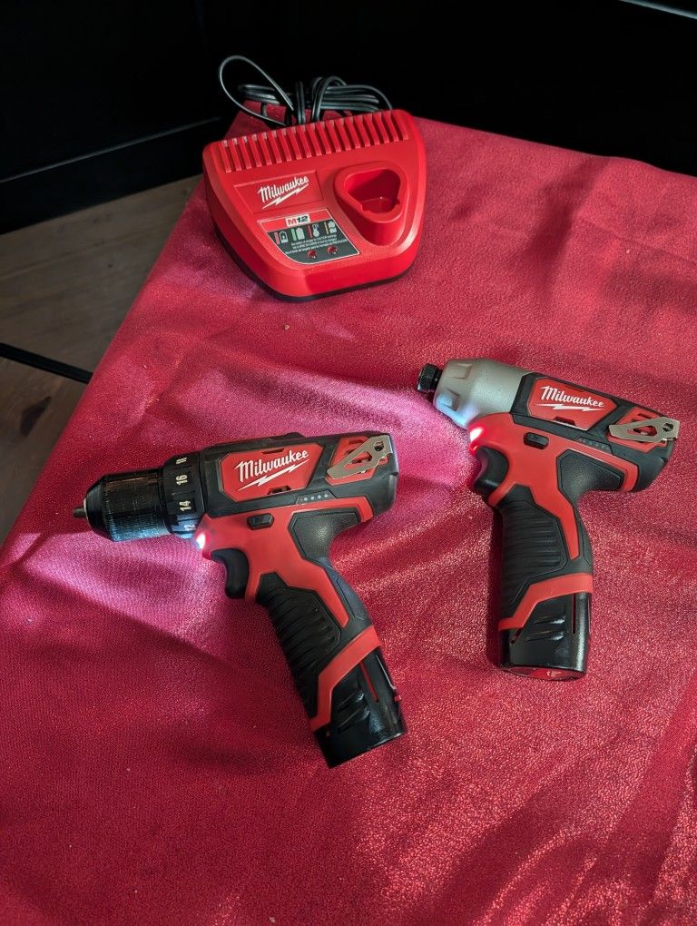 Milwaukee M12 Drill and Impact with 2 batteries and a charger... Minimal use only at my home... Save yourself the tax...OBO... Willing to TRADE for other Milwaukee tools... Thank you and God bless...