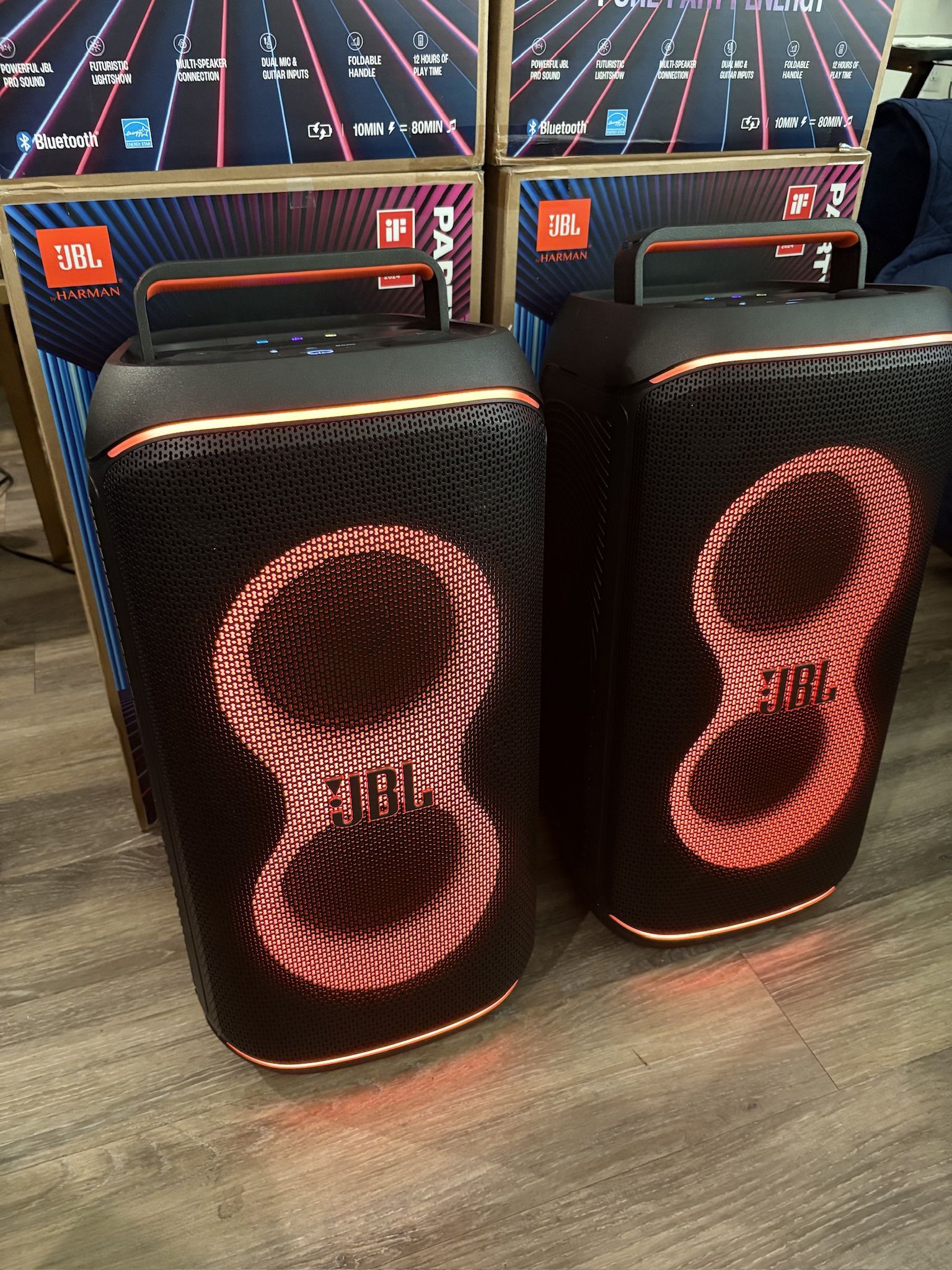 Comes New, Open Box. Available for Pick Up or delivery for additional fee. Price is for each! Message for any questions. Se habla EspaΓ±ol. π FOLLOW MY PAGE FOR MORE ELECTRONICS π π FEATURES & SPECS π β’ 160+Watts of JBL Pro Sound β rich bass, clear mids, and crisp highs β’ Portable Bluetooth 5.1 speaker β quick, stable wireless connection β’ Dynamic LED light effects that sync perfectly with the music β’ Mic & Guitar inputs β ideal for karaoke, live sessions, or events β’ Rechargeable battery with up to 12 hours of playtime β’ USB playback + AUX input for flexible music sources β’ TWS (True Wireless Stereo) support β pair with another PartyBox for double the sound β’ Rugged yet stylish design with easy carry handle for portability β’ Perfect for house parties, tailgates, outdoor events, or family gatherings