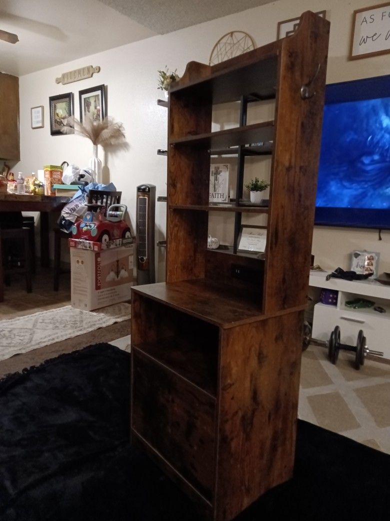 Selling in good condition this two-piece tall bookshelf with nightstand has a charging port built in dimensions 55" tall 20" wide 14 " depth asking $50