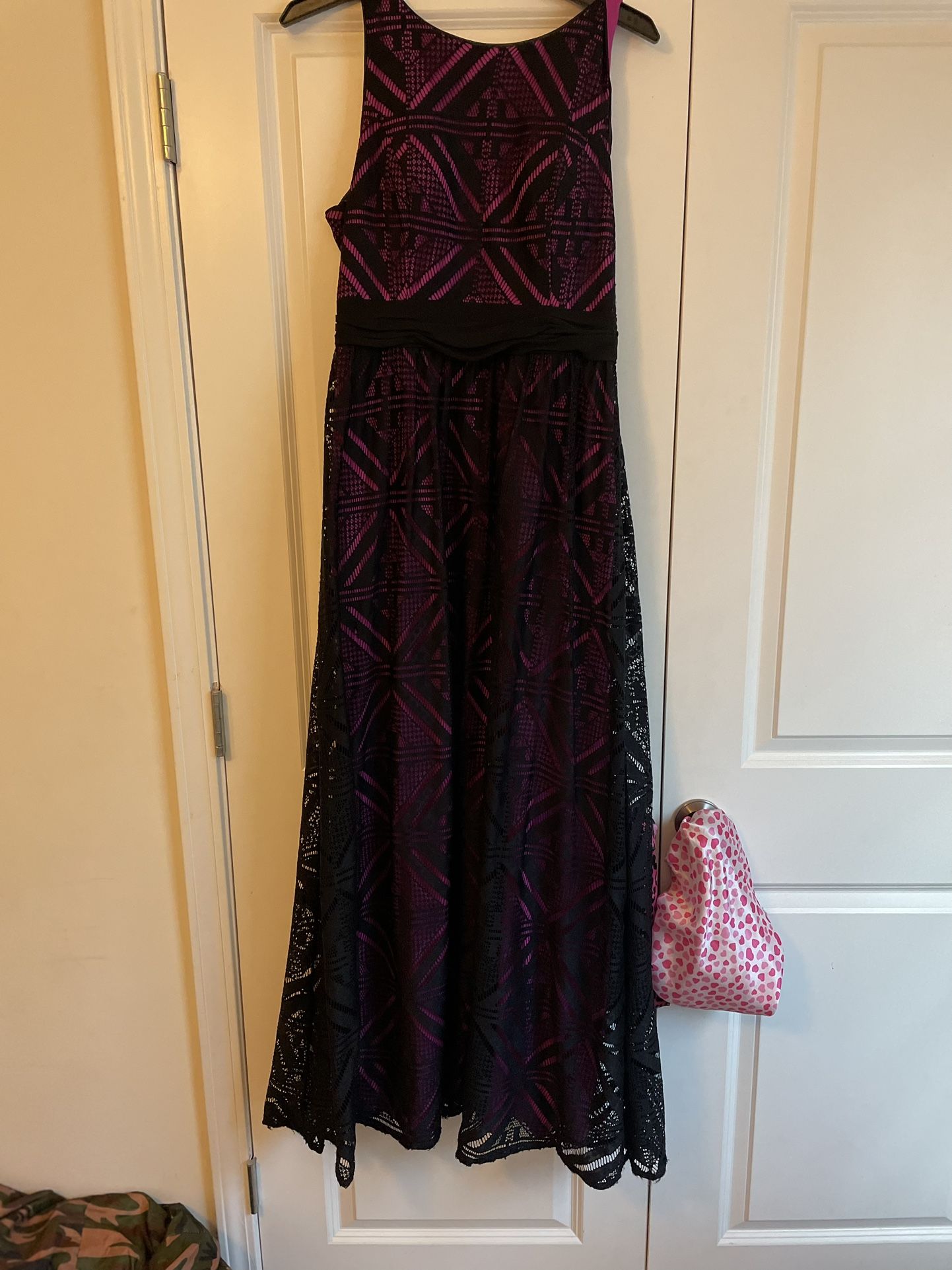 Adrianna Papell Lace sundress with hot pink underlay. Silver, tasseled back zipper adds detail. Size 8