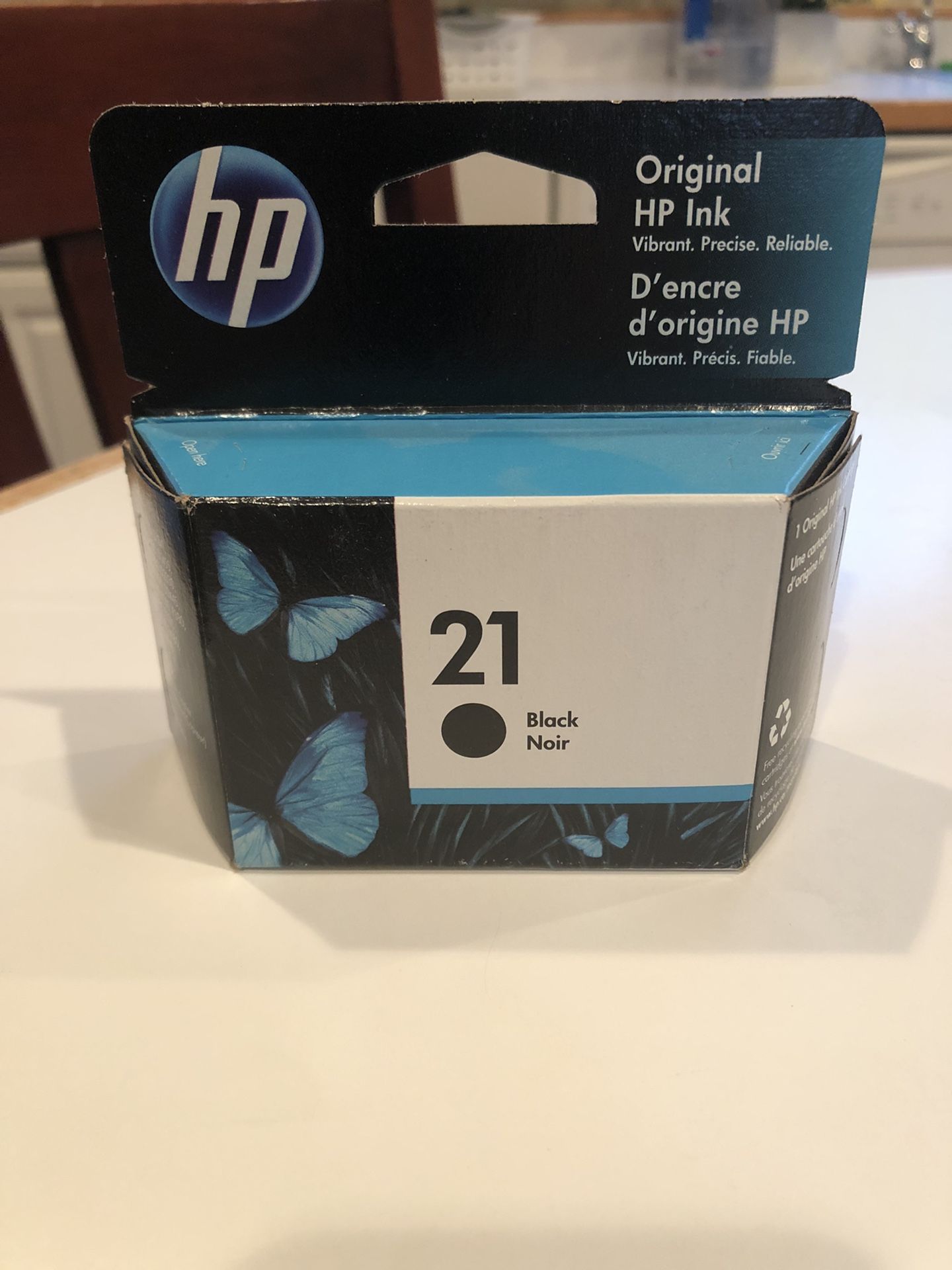 New in box, HP 21 black ink cartridge. Can’t use in my new printer.