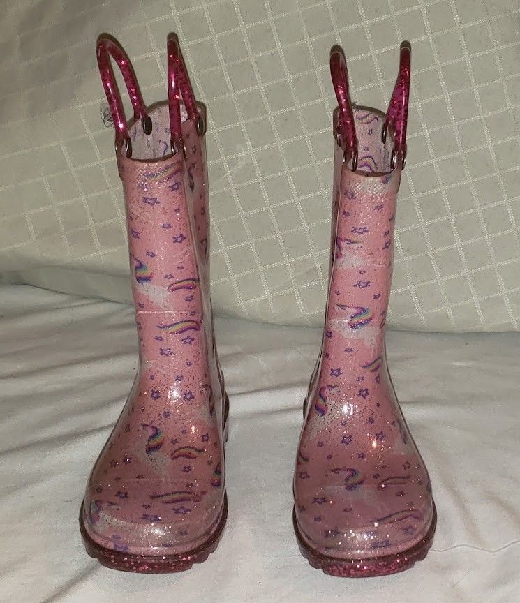 Western Chief Unicorn Rainbow Girls Rain Boots with Light up Heels, Size 7-8. In very good condition. 6.85"L x 2.85"W x 7.5"H. $14. Cash ONLY. **Click on my Profile for similar and other listed items that might be of interest to you. Buy one, get one 50% off of equal or lesser value.** Located in South Natomas (95833)...pickup is also available in the Rosemont area (95826). Pickup from Elk Grove, Roseville, Davis, and other local areas will be considered.