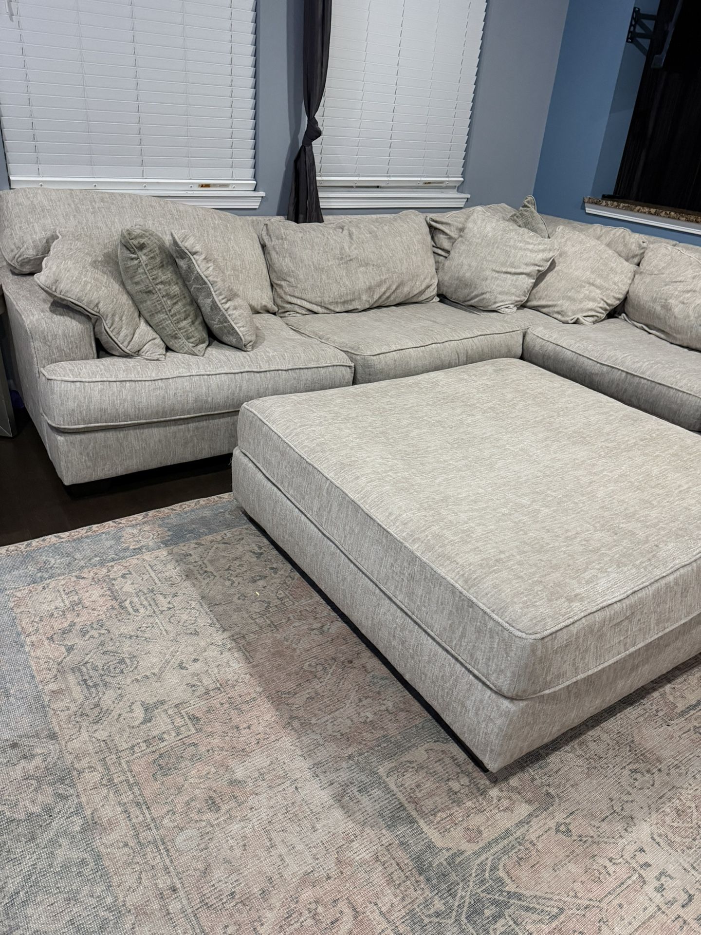 Comfortable sectional couch with huge matching ottoman and matching end tables. One cushion will need to have zipper repaired. But rest of set is in fairly used condition.