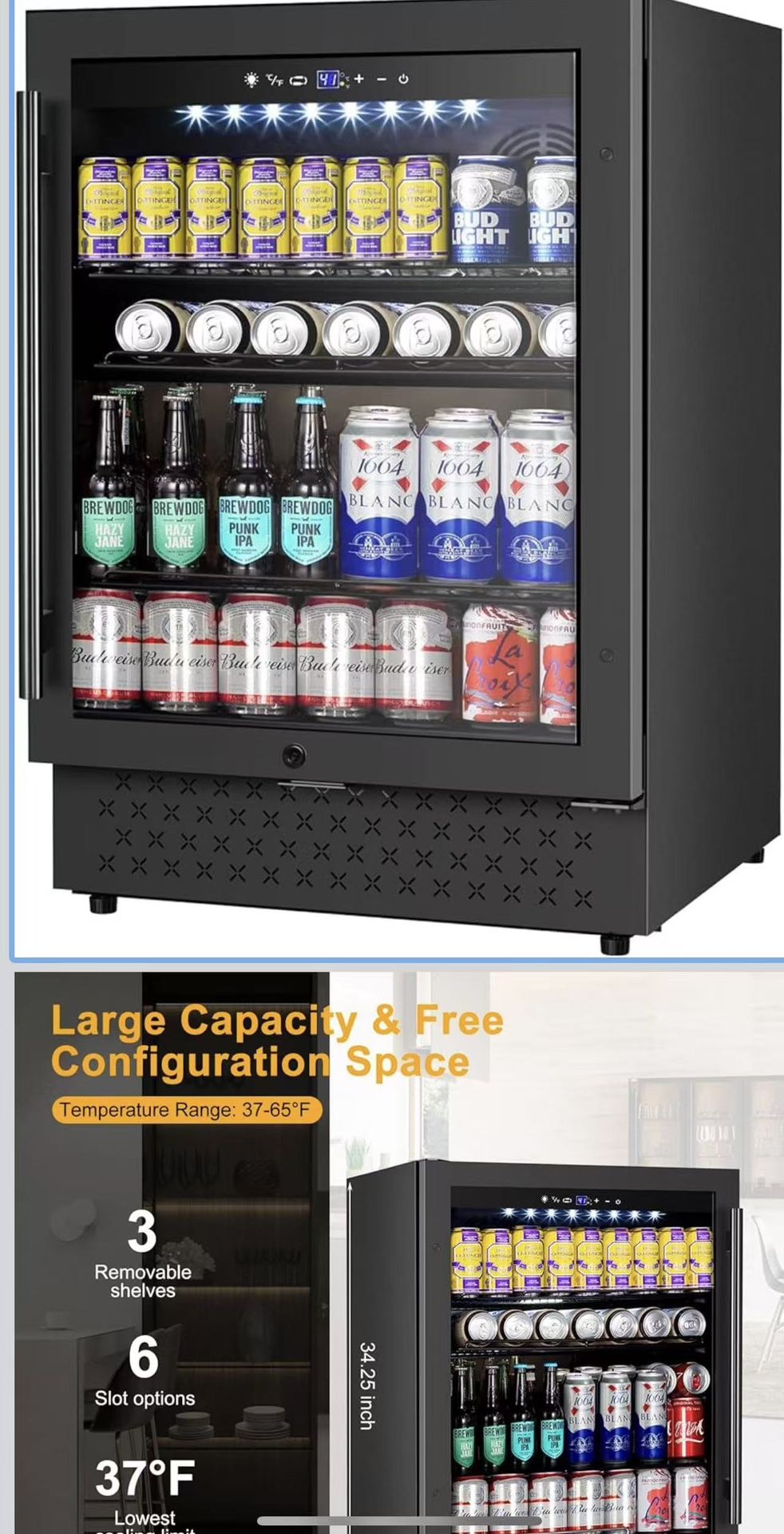 Beverage Refrigerator 24 Inch 200 Can Drink Fridge with Glass Door, Under Counter/Freestanding Beverage Cooler with Temperature Control, Reversible Door, Quick Cooling for Beer Soda Wine, Black$390