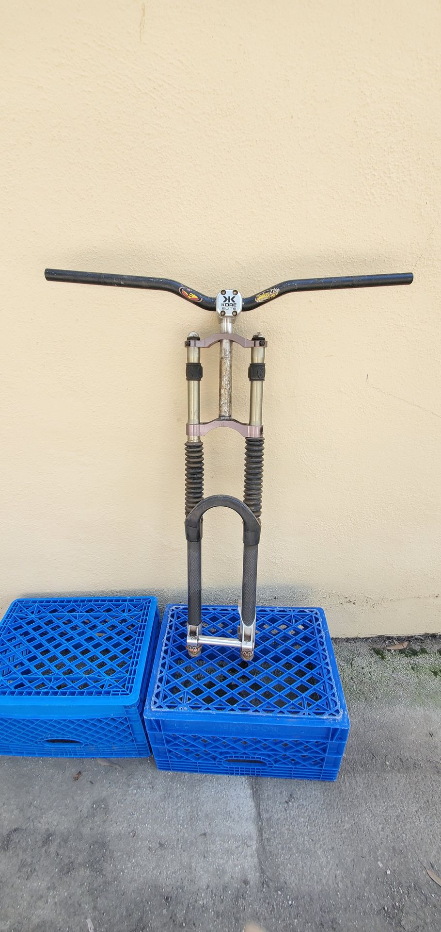MDR Manitou Racing Development carbon fork legs. Comes with Easton alloy handlebars and Kore Elite stem. Been in the shed for years. Certainly degraded, will definitely need service/rebuild. A piece of Mt Bike history.