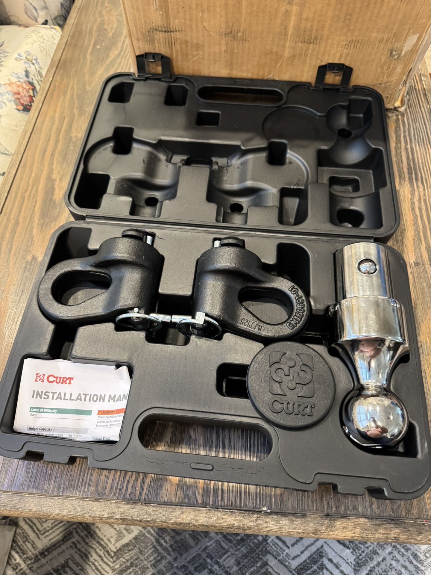 Only cash.Pickup only. • CURT 60639 OEM Puck System Gooseneck Hitch Kit for Chevrolet, Ford, GMC, Nissan Trucks, 38,000 lbs. GTW, 2-5/16-Inch Ball, Pucks Required PUCK SYSTEM READY. This gooseneck hitch kit includes a standard 2-5/16-inch gooseneck ball and safety chain anchors that readily outfit your pickup truck for gooseneck towing. All you need is the factory puck system • DROP-IN INSTALL. Installing the gooseneck ball and anchors in your truck bed couldn't be easier. The tow ball has a quarter-turn latch locking system that instantly secures it into place whenever needed. There are no tools, extra brackets, accessories or • HIGH-STRENGTH. Rated to tow gooseneck trailers up to 38,000 pounds, the 2-5/16-inch gooseneck ball is made from forged, machined steel. The safety chain anchors are constructed from cast steel and have large openings to accept heavy-duty clevis hooks. • CORROSION-RESISTANT. This gooseneck towing kit is finished for tough jobs and relentless weather exposure. The chain anchors are shielded in a durable carbide black powder coat finish, while the trailer ball has a chrome plating • EASILY PORTABLE. Take this gooseneck hitch kit wherever you go The components come in a heavy-duty plastic storage case and can conveniently be stored in a truck tool box or other compartment. These kits includes a gooseneck ball, two safety chain anchor