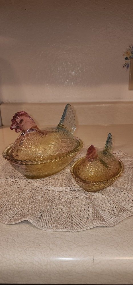 A very beautiful pair of hens on there nest. They was never used. Still in original boxes. The big one is 5.25" tall X 7.25" long X 5.25" wide. The little one is 3.25" tall X 4.75" long X 3.25" wide candy boxes. Absolutely no issue's.