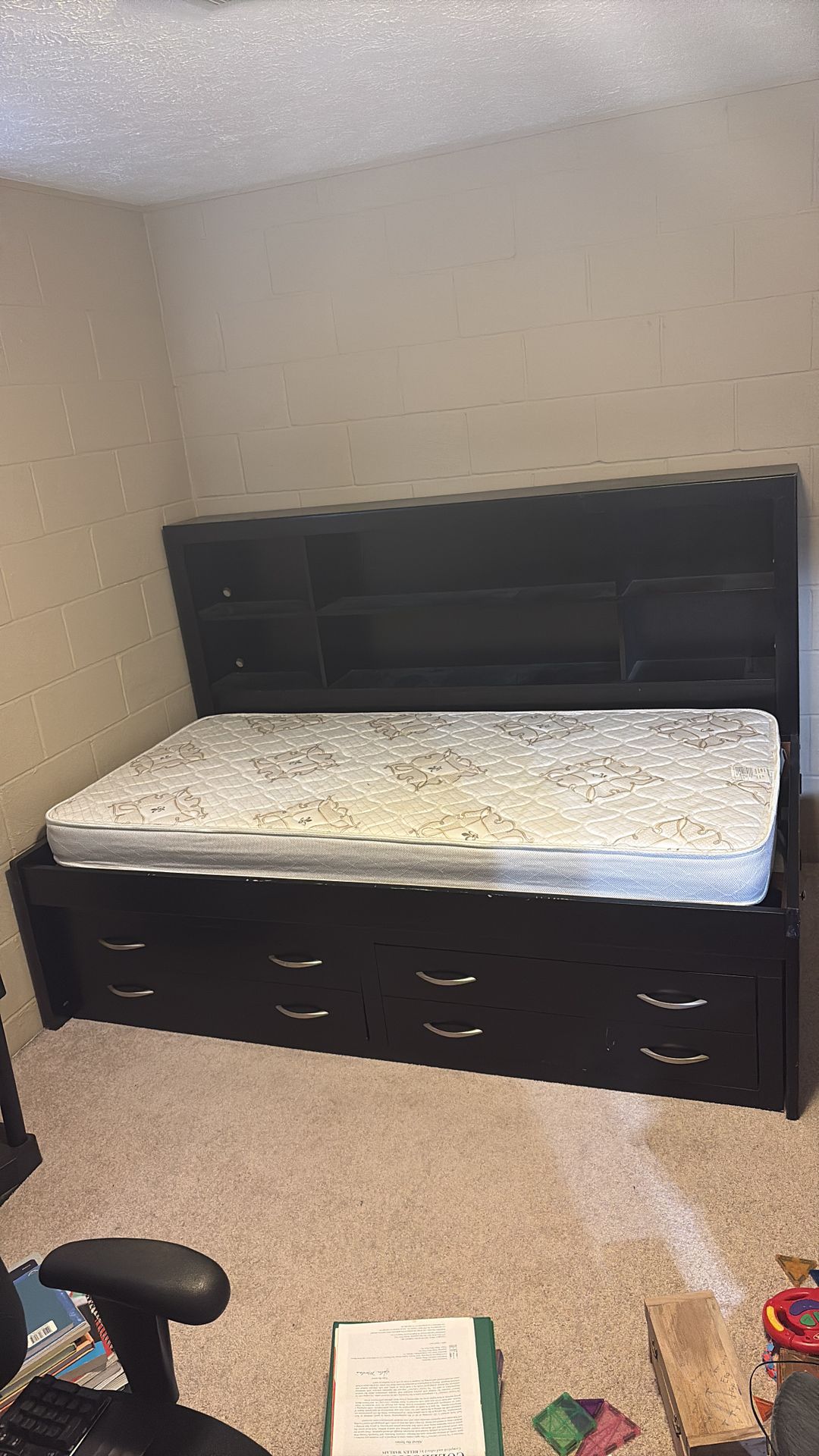 This black twin bed with six bookshelf cubbies, two massive drawers, and side doors to access underneath is in need of a good home. Has been in our family for many years but no longer needed. I can deliver, as well as help set up if needed. Price is OBO don't hesitate to make an offer. Thanks for looking!