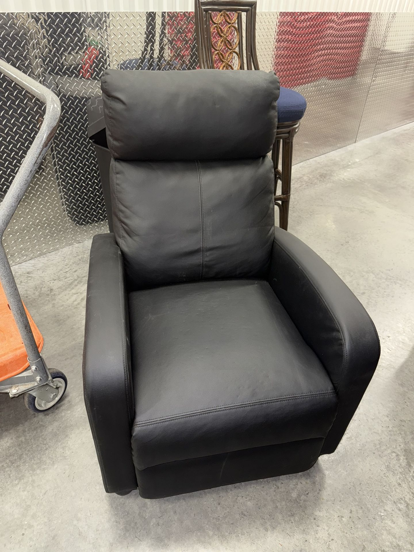 **Item is in storage, Must be willing to Pick up** Black leather, self pushback, Recliner. Used, look like new!