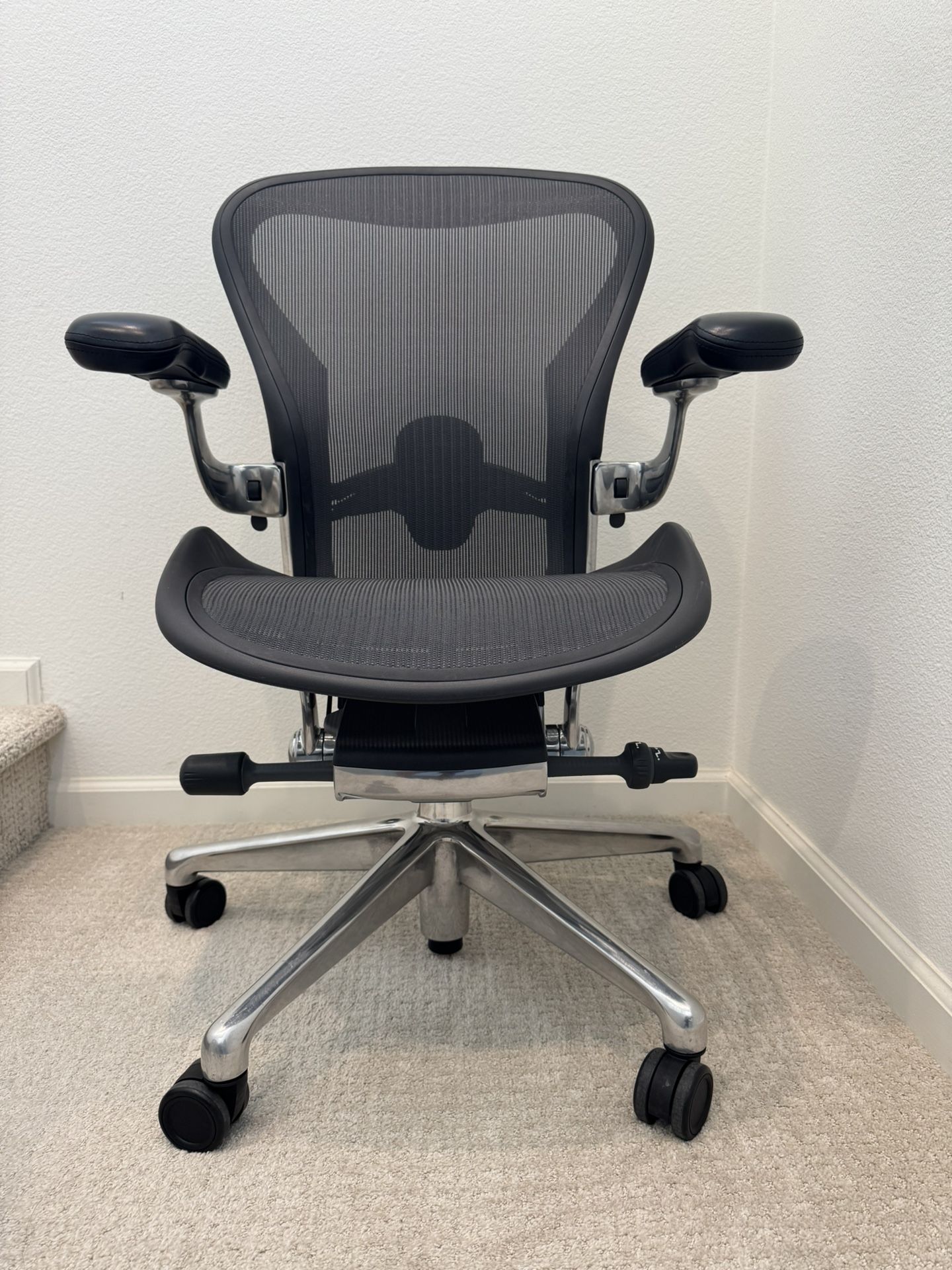 B size, floor samples, onyx color, fully loaded model with chrome frame. We provide 5 years warranty, the same policy as manufacturer’s, plus lifetime free maintenance! Product features: • polished aluminum frame and base • adjustable back lumbar support • tilt limiter and seat angle • fully adjustable arms and standard arm pads •multi surface casters with quite roll •leather arm pads •Headrest +$100