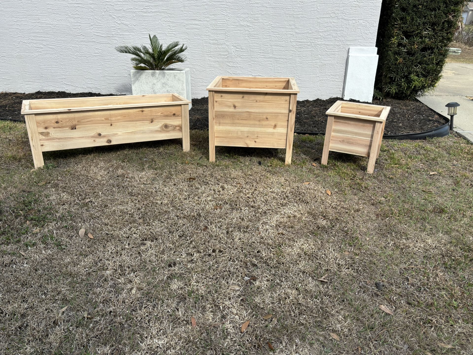 Handmade cedar planters available in 3 popular sizes. 16”x16”x17” $35 46”x16”x17” $75 24”x24”x22.5” $80 Located in Palm Coast.