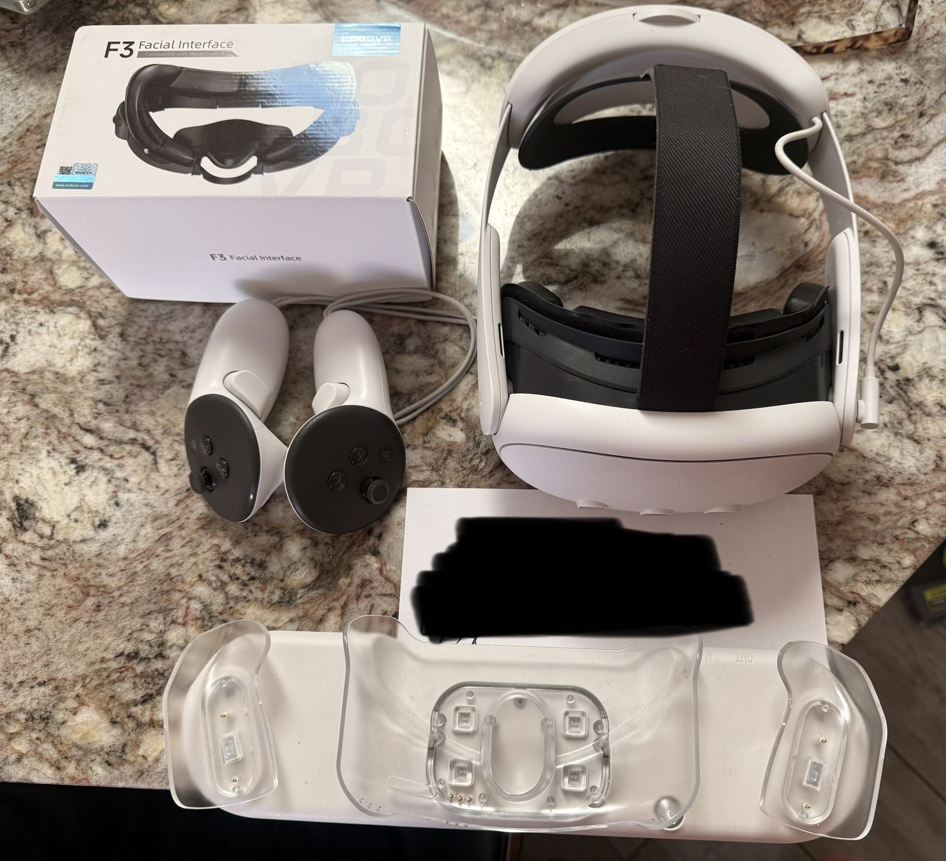 Adult owned and well taken care of, no damage to the lenses or headset. Comes with battery strap for longer use, a charging base (wall charger + USB-C included), and BOBOVR F3 facial interface (comes with the stock facial interface as well).