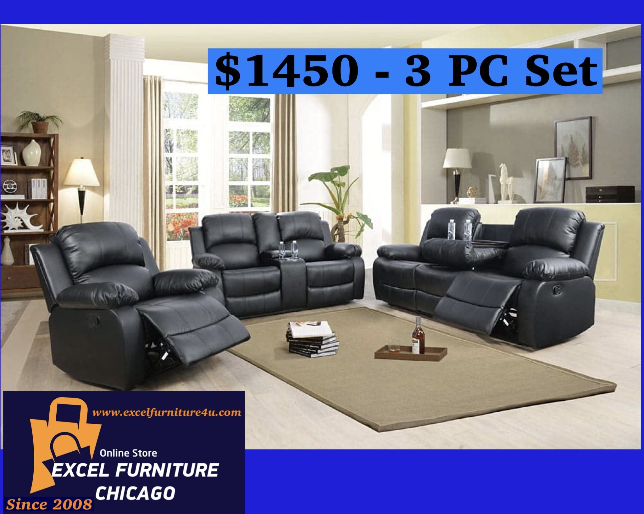 ORDER AND PAY UPON DELIVERY ( pay to the driver in your house) We work in Chicagoland area & around ( Chicago, Rockford, Milwaukee) Excelfurniture4u. com - Online Furniture Store RECLINER SOFA,LOVESEAT,CHAIR BRAND NEW FURNITURE !!!! Reclining Whole 3pc set Delivery -$75( possible the same day delivery) 6 months manufacturers warranty Sofa, couch , love seat