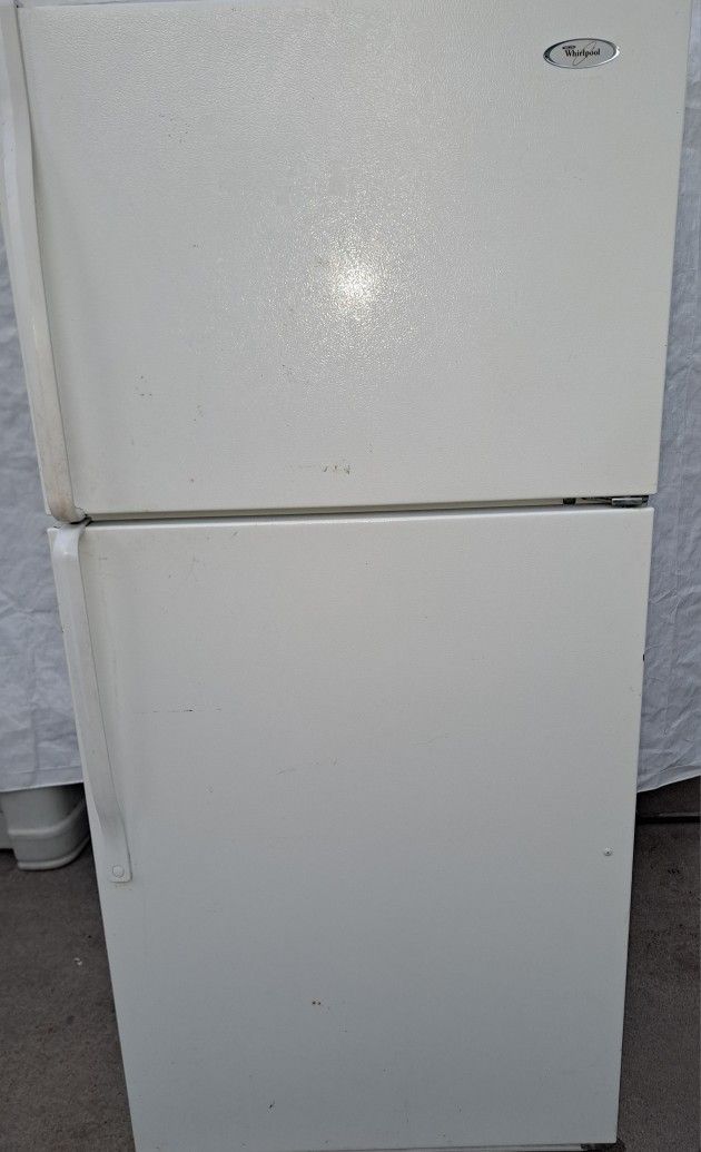 •Whirlpool •Used still works great. •The refrigerator in the image is a Whirlpool 14 cubic foot top-freezer model. It has a width of 28 inches, a height of approximately 63 inches, and a depth of about 32 inches. The refrigerator compartment offers 10.46 cubic feet of space, while the freezer provides 3.87 cubic feet. This model typically features 3 adjustable shelves, 2 fixed door bins in the freezer, and an optional icemaker. •Make an offer if interested,please.