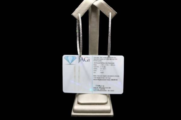 Check out these exquisite pre-owned 14K White Gold 3.16 CTW Diamond Inside Out Hoop Earrings. We have meticulously cleaned them to restore their dazzling beauty. These earrings boast an inside-out hoop design adorned with 158 round brilliant cut diamonds, each weighing 0.02 cts. The diamonds exhibit a color grade of H-I and a clarity of SI1-I1. With a substantial weight of 20.1 grams, these earrings are a true statement piece. You can assess the cosmetic condition through the provided pictures. Take advantage of our convenient layaway plan, requiring only a 30% deposit of the grand total. These stunning earrings are available for purchase during regular business hours, exclusively for in-store pick-up. For additional information, please contact us. 49727oo (ixx/13.2) EV