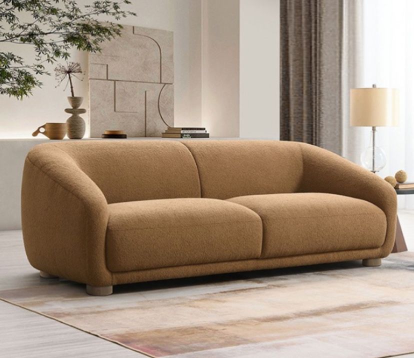 New in box white contemporary sofa Boucle fabric High density foam Slope arms Dimensions 88W x 38D x 29H Available in white, brown or black color Matching loveseat available for extra Delivery is extra No showroom Modern sofa Kolvere