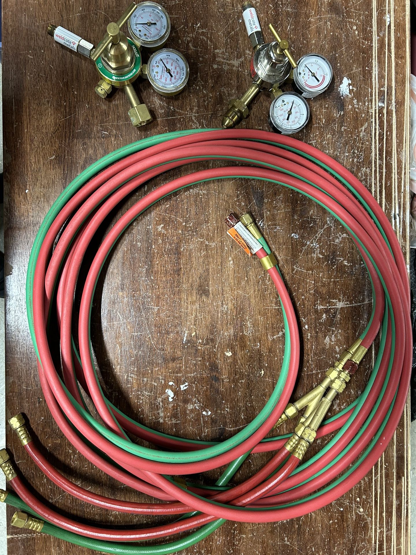 25’ Oxygen/Acetylene Hose with dual port adapters and regulators equipped with flashback arrestors