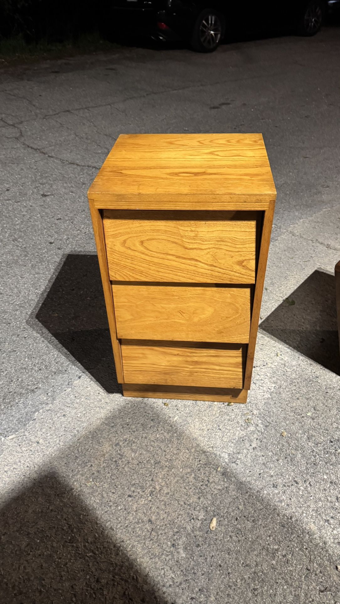 For pickup only A compact, rectangular 3-drawer wooden nightstand/side chest featuring a warm honey-oak finish and flat, handle-less drawer fronts with recessed pulls. The lines are clean and minimal, giving it a Mid-Century or Scandinavian-inspired look. It’s built with a sturdy box frame and sits on a low base, making it suitable as a bedside table, a small dresser, or a storage piece for an office or studio. 18” W x 18” L x 29” H