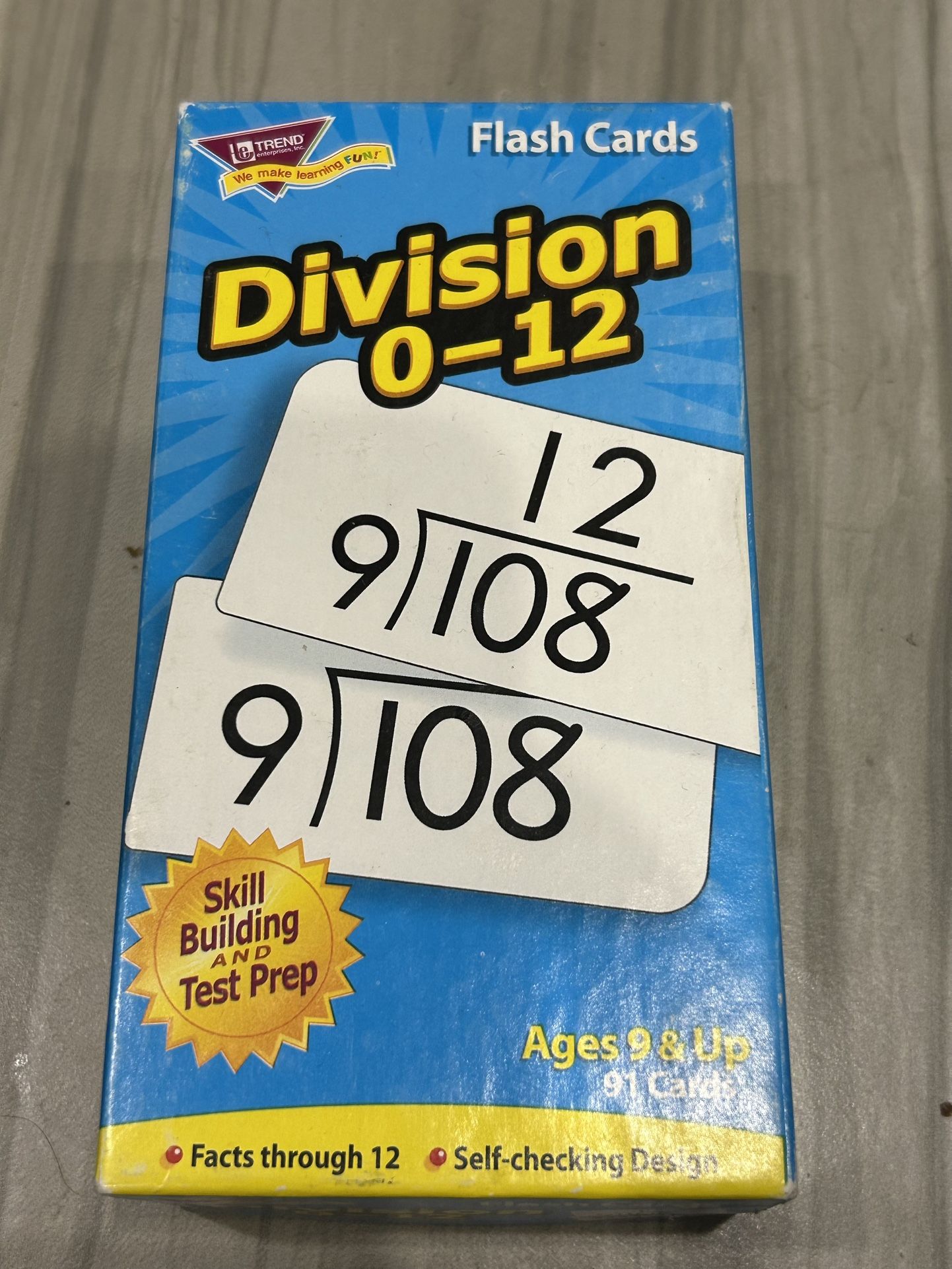 Division flash cards 0-12. I didn’t count the cards to make sure all are there. Have answers on the back. One side of the box broke.