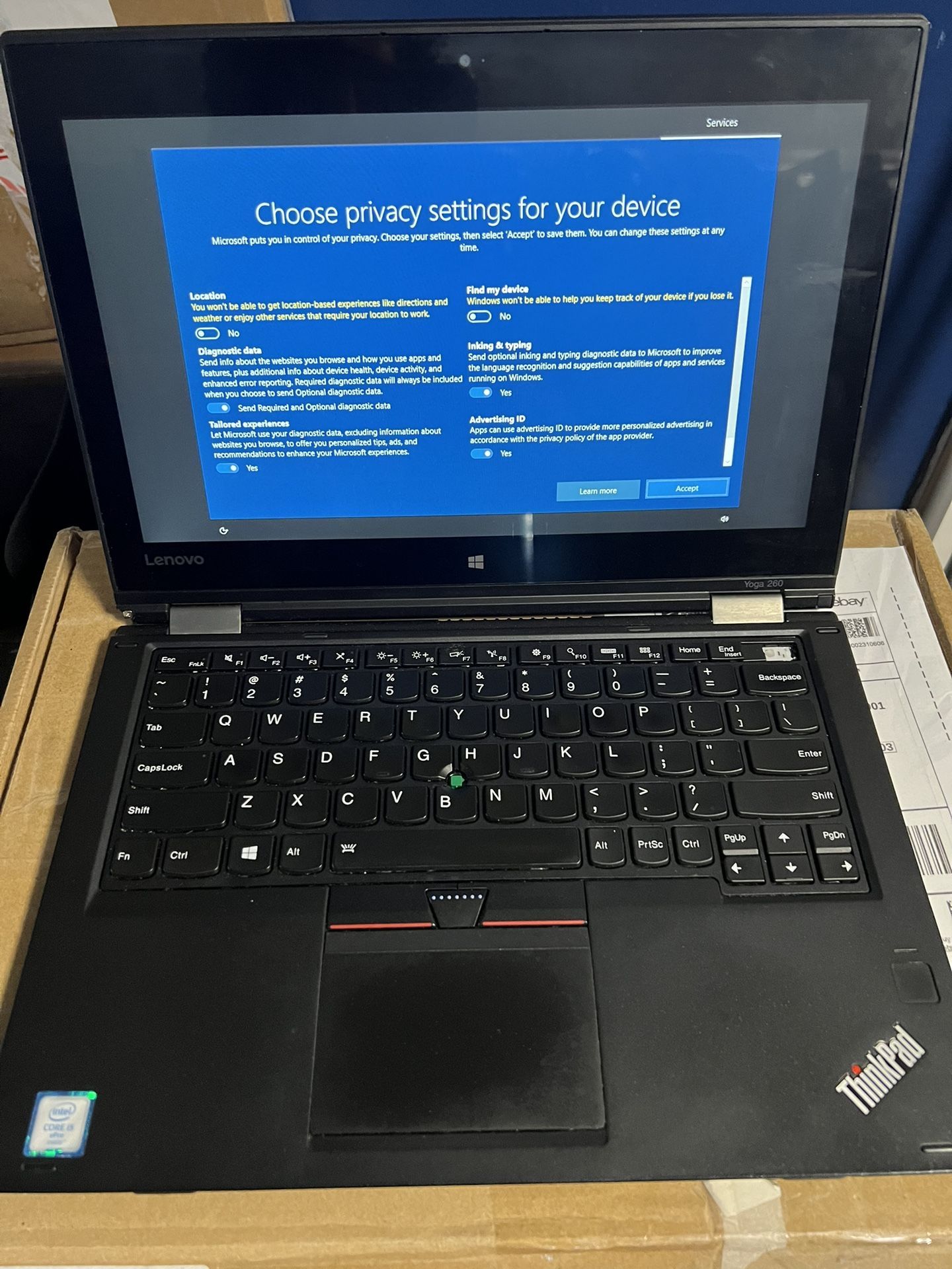 Lenovo ThinkPad Yoga 260 i5-6200U 2.3GHz 8GB 160GB SSD Win10 includes power adapter Brand new battery! 6/10/24 Missing del key but it's still works Se Habla Espanol cash only se habla espanol all sales are final cheap laptop