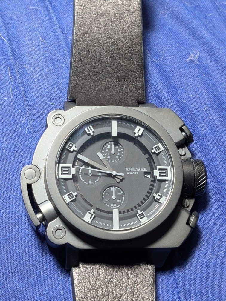 Very nice time piece. Black on black Diesel watch , with leather band. Needs new battery.