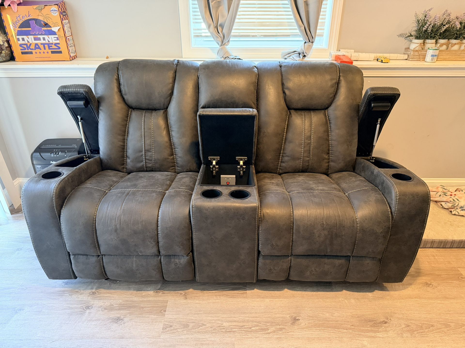 Selling my bobs furniture sofa and loveseat set in the color graphite. It is a polyester material with bob-o-pedic memory foam. Basically brand new only used it for about 3 weeks before buying another sofa. The sofa has 2 power recliners, 2 cup holders, charging ports and a lift up storage on each side. The middle seat also comes down for more cup holders and a light. The loveseat has 2 glider chairs 4 cup holders and 3 different lift up storages with charging ports.