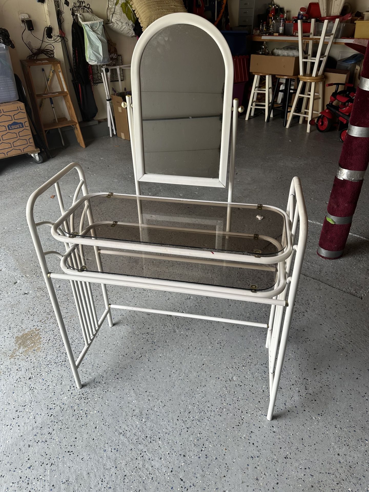Metal frame nice Vanity, with two glass shelves, total H with mirror 50, Side frame H 33, Top tier shelf H 28.5, Bottom tier shelf H 23, Vanity W 30, Vanity D 14.25