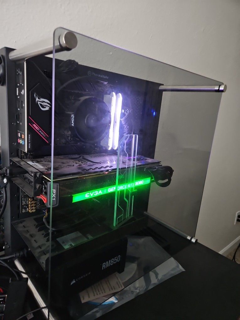 Hi, here's the specs: GPU: EVGA NVIDIA RTX 3080 CPU: AMD Ryzen 5600X Tower: OPEN-CASE ATX Motherboard: Asus B550 Any additional information, shoot me an offer, - Comes with a 1080p 165hz Samsung Odyssey G5 (Freesync) monitor, and if you want to take the corner desk, take it off my hands, it all comes apart with a simple Allen wrench. Easily moveable and I can help set up if asked. I moved into a small studio apartment and it takes too much space. My girlfriend and I need a dinner table to eat, unfortunately that takes place right where I played games. That being said, I don't want to eat oatmeal and bread on the counter before work, please take this from me. I will thoroughly dust and clean the pc and the desk and disinfect it.