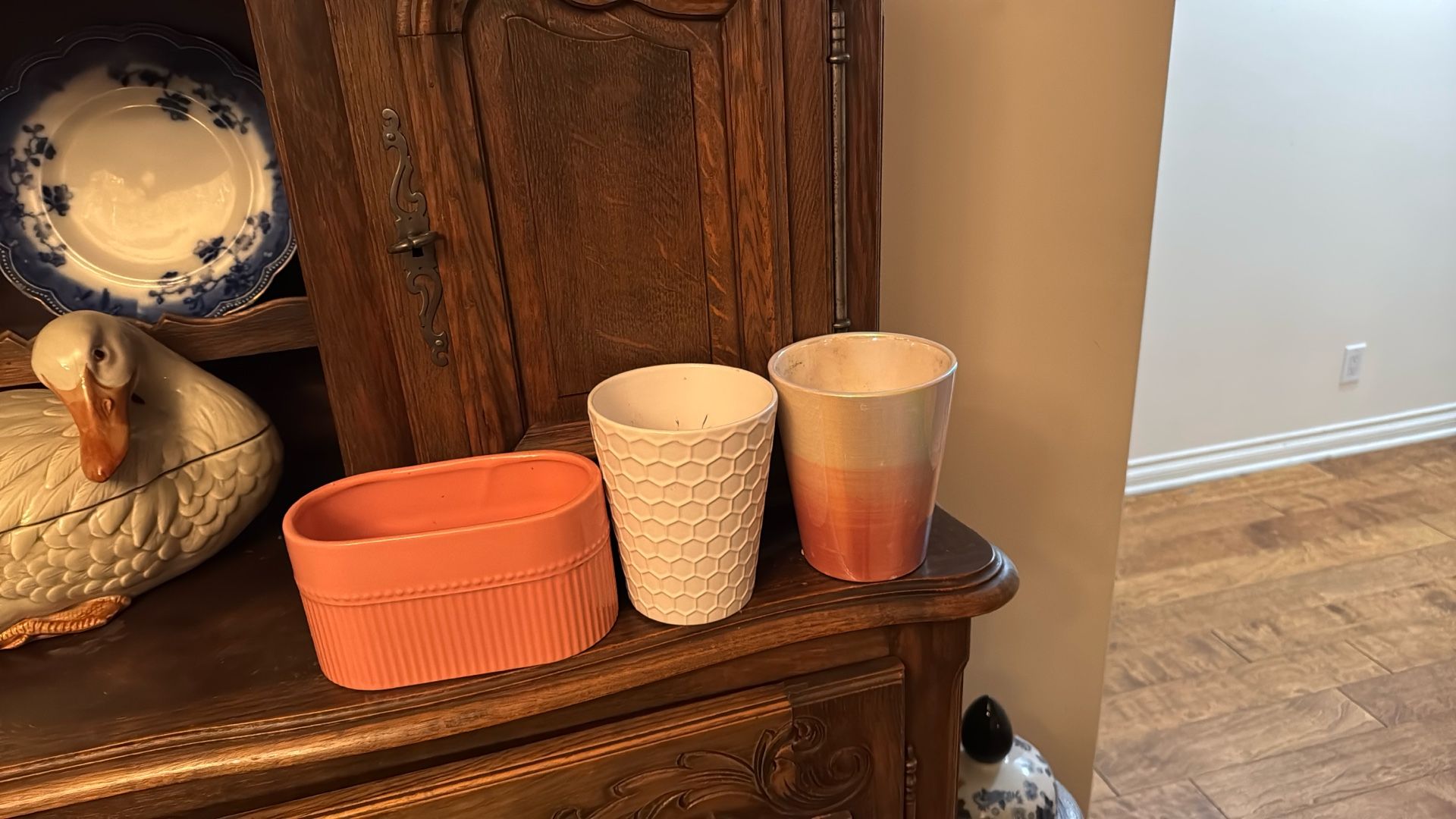Could be used for various things sold. as a bundle 1 is peach, 1 has an octagon print and is white and the other is an ombré peachy ink to white - use for plants, flowers orchids, pencil holder, miscellaneous container, organizer Cash and pick up only