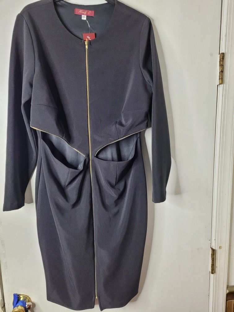Black with gold, cut out zipper. Size 1x (14/16). 95% Poly and 5% spandex lining.
