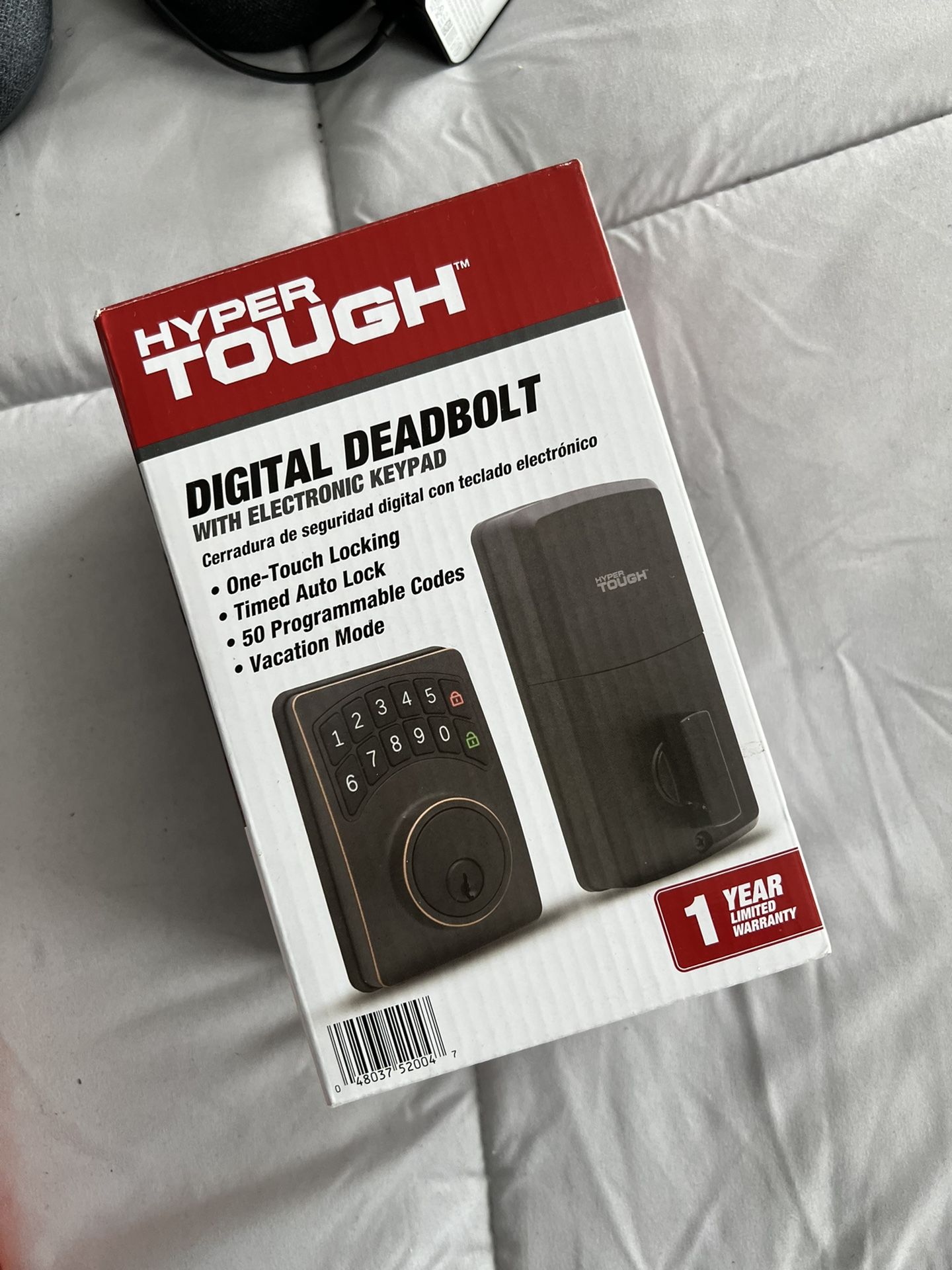 The Hyper Tough Electronic Digital Deadbolt- Oil Rubbed Bronze offers keyless convenience. The easy to operate lock has one- touch locking, auto locking and 50 programmable codes. With easy installation this lock will easily provide your security needs with one- time user codes, vacation mode and a failed attempt alarm. Open Door with Digital Passcode or Key Easy to Install Low Battery indicator Specifications Brand Hyper Tough Assembled Product Weight 2.43 Ib Assembled Product Dimensions (Lx W xH) 4.88 x 3.82 x 7.87 Inches