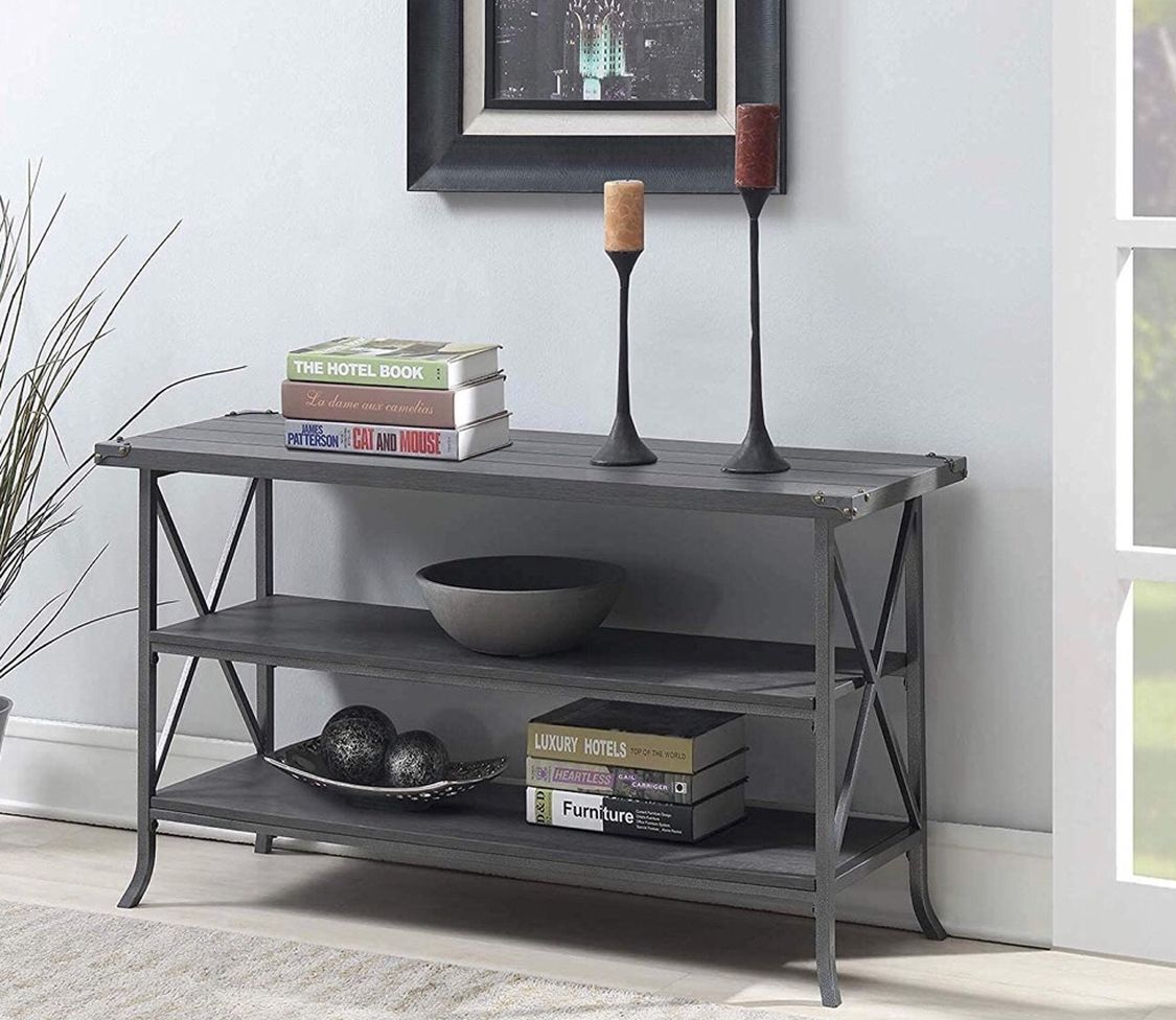 Brand New in Box. Retail for $199+tax. Can be used as TV Stand or Bookcase or Storage Shelves. Color: Charcoal Gray/Slate Gray Frame. Built of 15mm heavy duty engineered wood and Metal. 2 fixed, open shelves. Easy 3-step assembly. Weight: 50lbs Dimensions: 47.25W x 15.75D x 26.25H in.