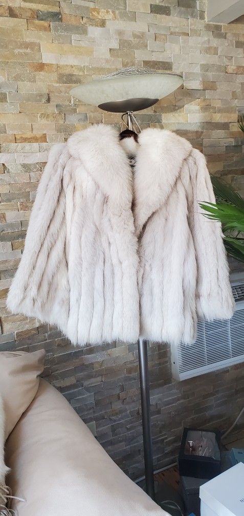 Incredibly luxurious and classy this is a High end Norwegian Blue Fox Fur in a ladies Small - Medium. Vertical lines give you a nice slimming look and this goes well dressed up or with your favorite jeans and boots. Extremely warm, with a beautiful satin lining and 2 hidden velvet lined pockets. *** From clean, smoke free home. Pick up in Melrose Park or possibly Old Town or West Loop.