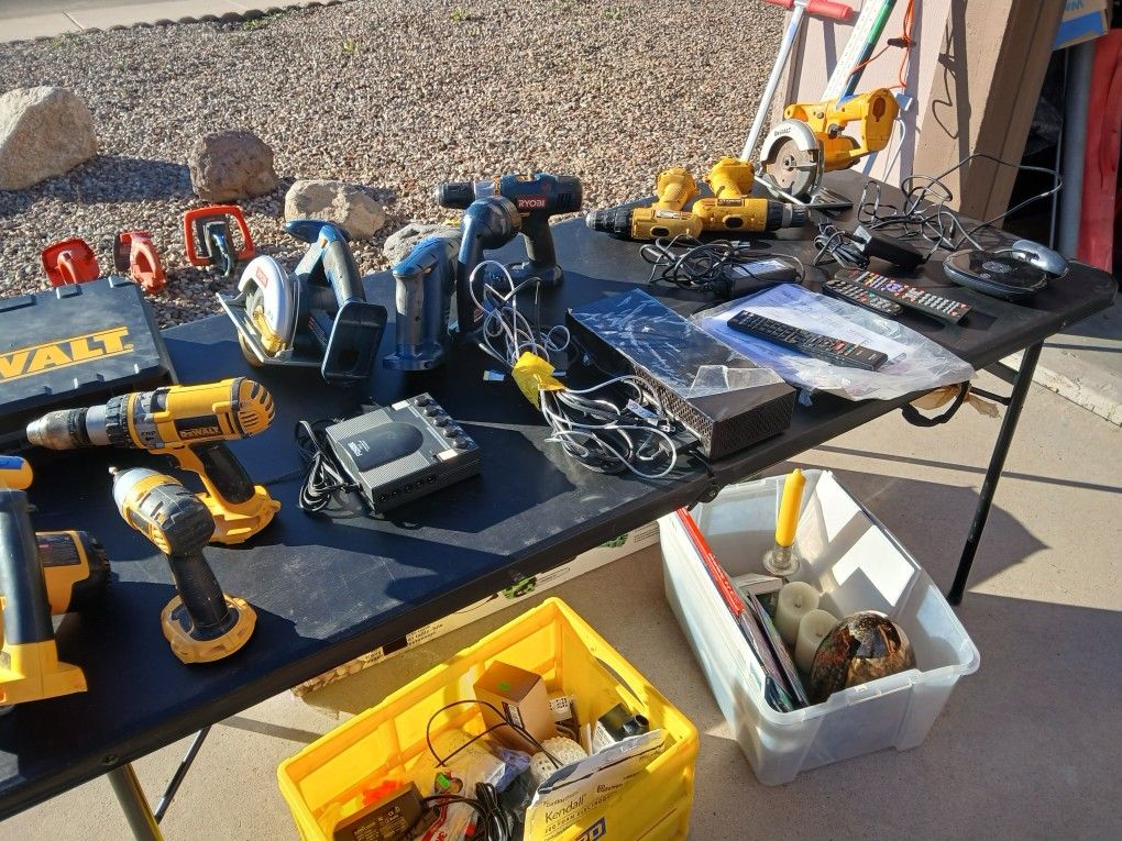 7414 W Oregon Ave Glendale AZ 85303 Cross streets 75th Ave and Camelback rd just north of Camelback GREAT DEALS ON power tools yard tools dishes ladders lot of drills lot of sockets and wrenches tools of All Sorts adult clothes kid clothes men and women boys and girls