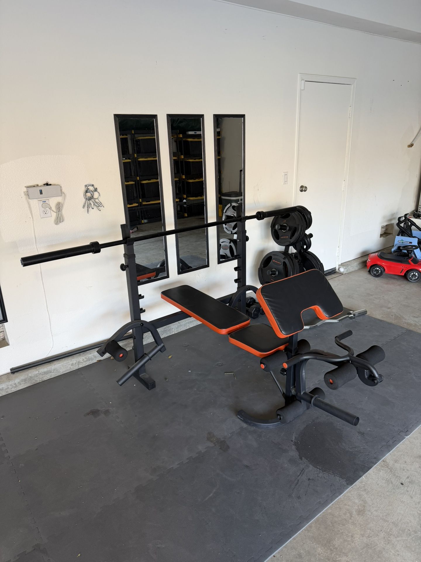 New Bench Press, rarely used. Comes with the 45lb Bar, Curl Bar, and Weights (2x45, 2x35, 2x25, 2x10, 2x5)