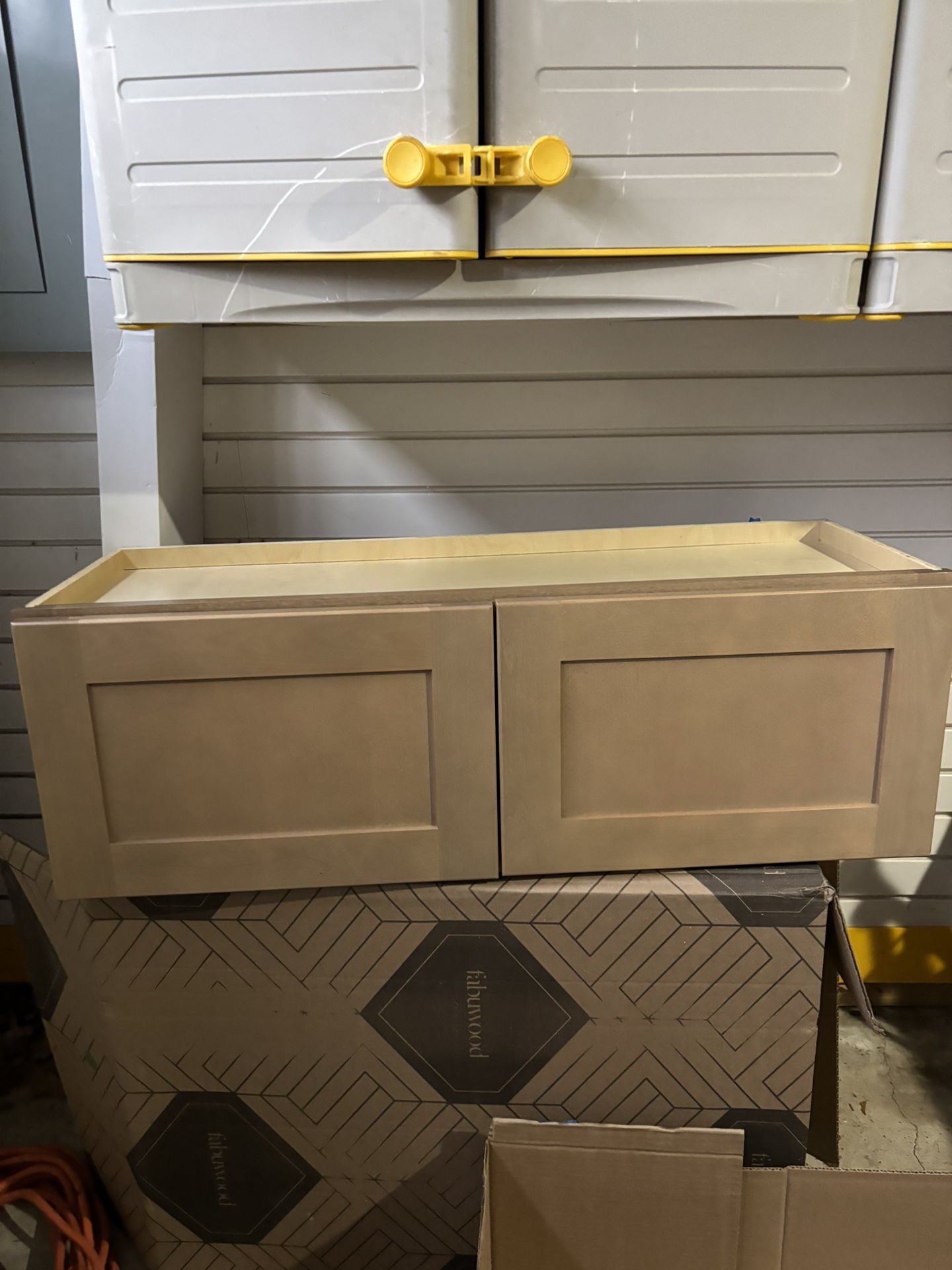 Brand new, unused Fabuwood wall cabinet in a natural/tan wood finish with classic shaker-style doors. This cabinet was part of a larger kitchen renovation, but new appliances required different cabinet sizes, so it was never installed. Only opened to take photos for listing — otherwise untouched and stored indoors in the garage. Details: • Brand: Fabuwood • Style: Shaker • Color/Finish: Natural / Tan wood tone • Dimensions: • 36” wide • 12” tall • 13” deep (to front of door) • Double-door cabinet • Soft-close hinges • Clean, finished interior Condition: • Brand new • Never installed • No damage, no wear Pickup only (solid cabinet). Great for: • Upper kitchen cabinets • Laundry rooms • Mudrooms • Basement bars • Custom storage projects Message me with any questions — happy to provide additional photos or measurements.