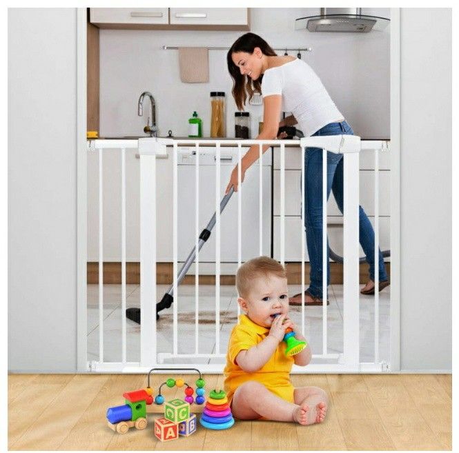 New in box Comomy White Extra Wide Baby Safety Gates, Auto Close Baby Gate for Stairs, doorways,Hallway, Fireplace Fence Hearth Gate BBQ Metal Fire Gate. 29.5''-40.5'' Fit Openings: 29.5"-40.5" (include 2.75" & 5.5" extension kit) Baby Gate Height: 30" Installation Method: Pressure Mounted OR Hardware Mounted for Extra Safety Auto Close for Both Direction: Yes