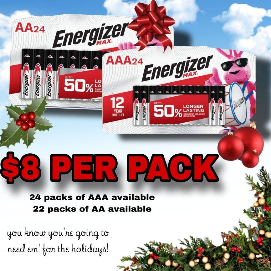 Brand new and sealed. Energizer, 24 count packs. AA and/or AAA available. $8 per pack. Pickup preferred. Delivery based on location and size of order.
