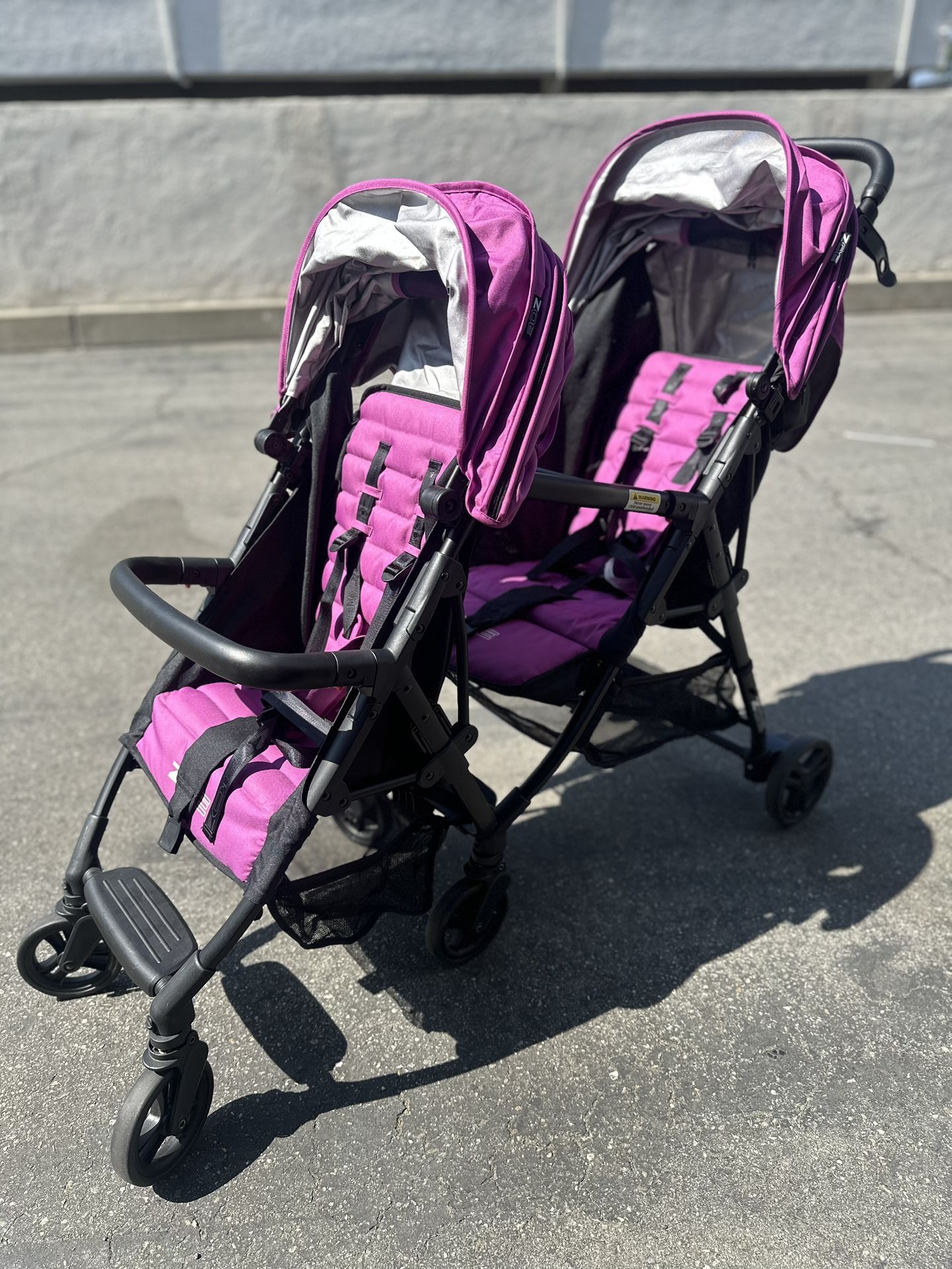 Twice used Zoe tandem lightweight stroller. Can be easily taken apart to use single stroller. Folds well and is easy to carry.