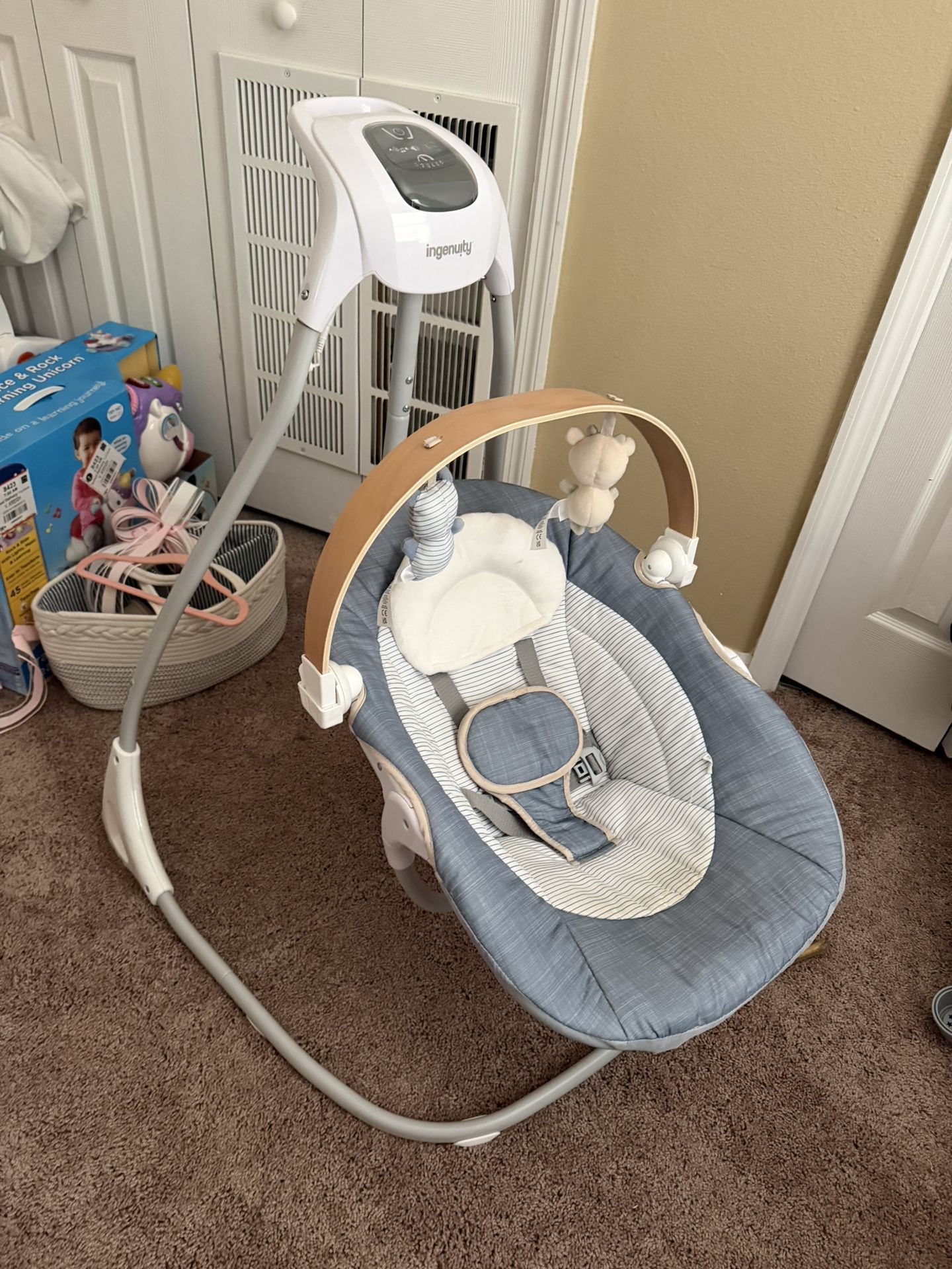Gently used **Ingenuity baby swing in great condition. Clean, well cared for, and works perfectly. Features multiple swing speeds, soothing music, and a comfortable seat that helped keep our baby calm and entertained. Great for naps or giving parents a few hands-free moments. From a smoke-free home. Perfect for newborns and young infants. Message me if you’re interested! 👶✨