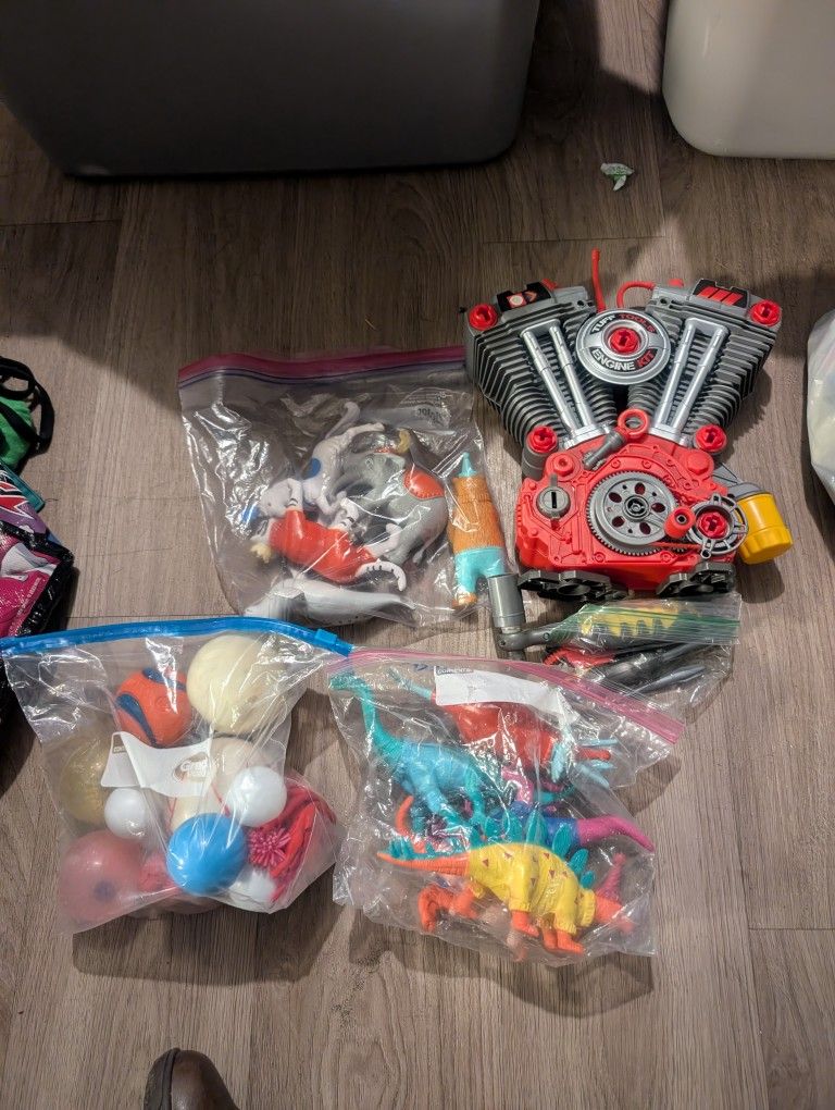 Party circus animals. Party dinosaurs. Balls. Mechanic engine toy. As is. Willing to bundle. OBO