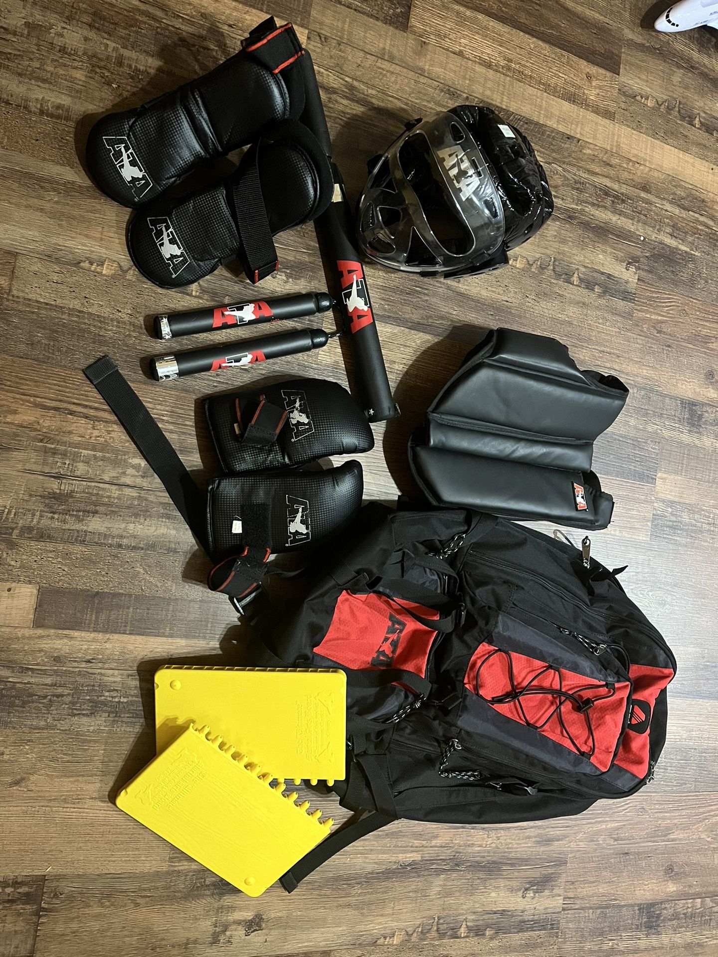 ATA kids karate equipment. Head gear. Chest protector, gloves, feet pads, large backpack style bag, 1 nunchuck, one striking stick, yellow breaking board
