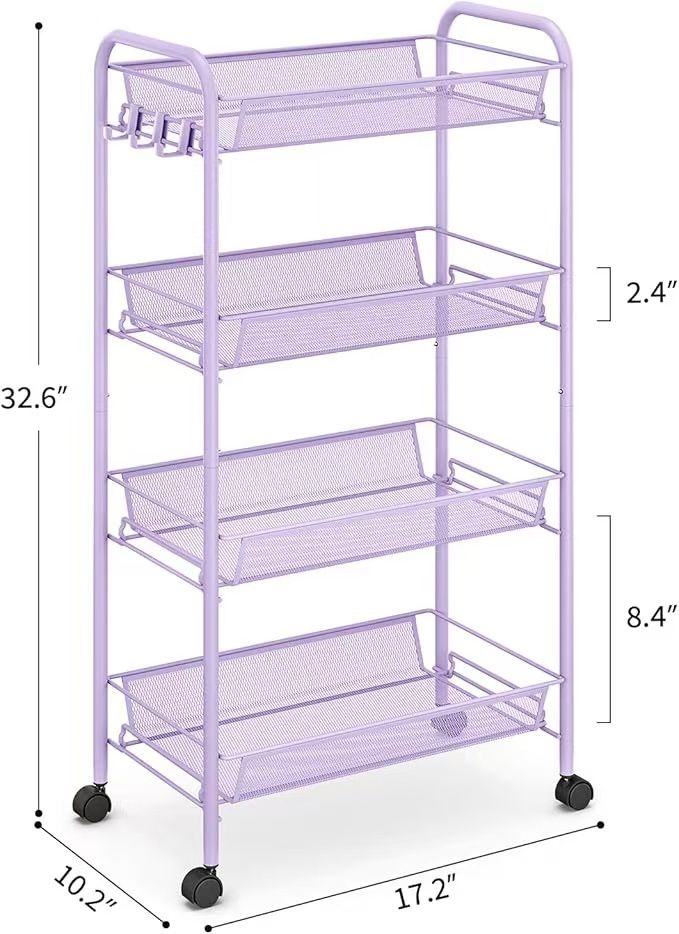 Four-tier rolling trolley, multi-purpose metal trolley with 3 hooks, easy to use (purple, black).