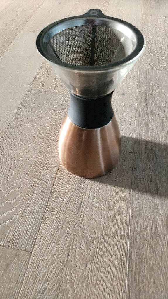 Hey, check out this Asobu pour-over coffee maker! It's in great shape. Keeps coffee hot and fresh for up to 12 hours. It's stainless steel, 32 oz., and made of heat-resistant glass – easy to hold, too.